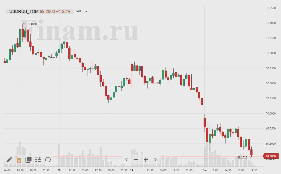 Банк России продолжает достаточно активно присутствовать на валютном рынке, регулируя уровень волатильности интервенциями. Впрочем, масштабы продаж заметно снизились за последнее время – по данным регулятора, объем операций по продаже иностранной валюты на внутреннем валютном рынке 28 мая составил 11,3 млрд рублей, в то время, как 27 мая было продано 11,4 млрд рублей, а до этого объемы реализации валюты доходили и до 21 млрд рублей. Отечественная валюта не могла не отреагировать на столь бурный рост стоимости углеводородов, начав укрепляться пропорционально дорожающей нефти. Более того, в отличие от энергоносителей, российский рубль даже не отметился сколь-либо заметными коррекциями за все прошедшее время: