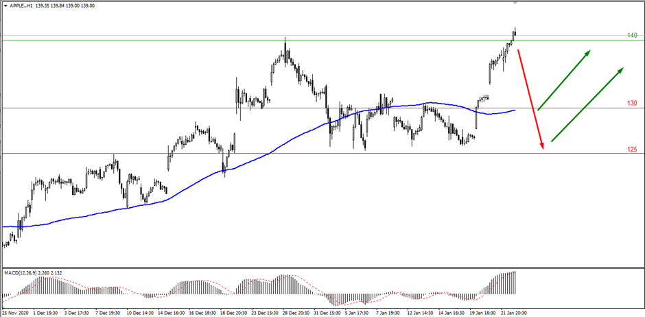 Сейчас цена находится в районе уровня 140 $, что является максимальным значением после сплита. К этой цене актив подходил в конце декабря 2020 года, но после отступил к отметке 125 $, и вот пару недель назад набрался смелости вновь пойти в атаку. Шансы на новый импульс вверх хорошие, но рисковать мы не рекомендуем, а советуем подождать корректировки в район 130 $, или, если будет возможность, и к отметке 125 $. Эти цены более привлекательны для покупок, так как хорошо защищены покупателями.