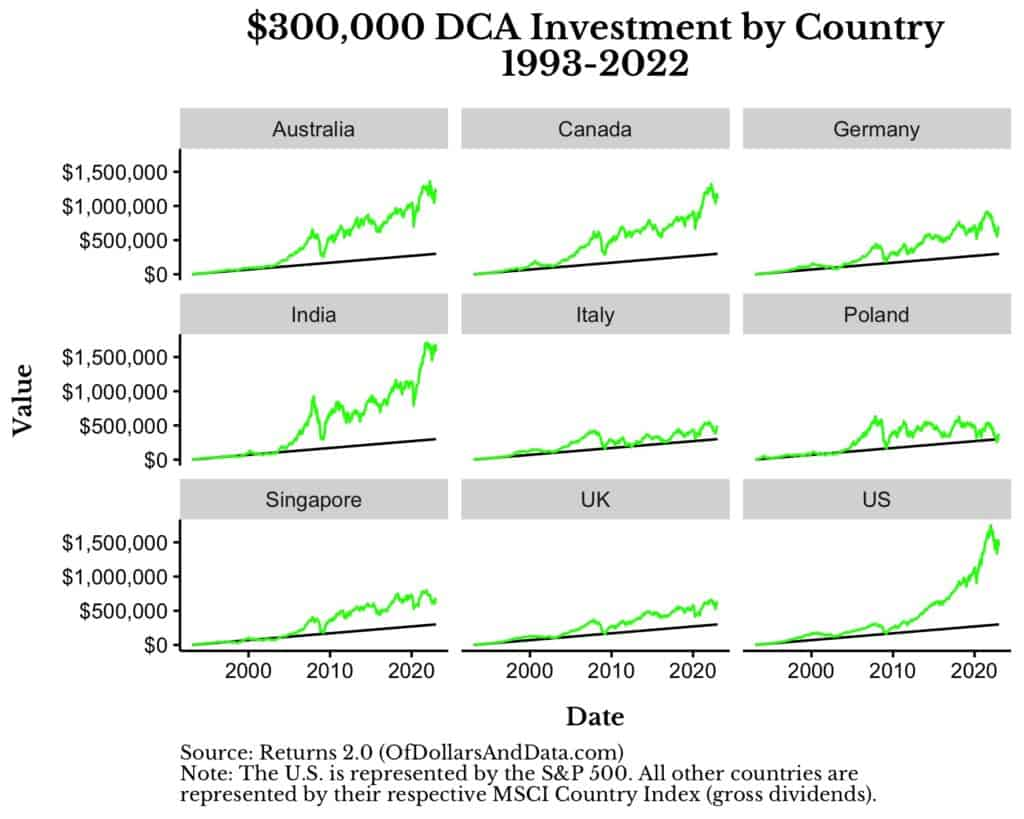 На графике ниже показано, сколько было бы вложено $833 в месяц ($10 000 в год) за 30-летний период с 1993 по 2022 год (для каждого из наших девяти фондовых рынков). Обратите внимание, что на графике показаны совокупные взносы (т.е. на основе затрат) с течением времени (черным цветом) и рыночная стоимость вашего портфеля (зелёным цветом) для каждой страны: