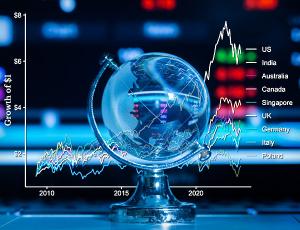 График, показывающий рост международных акций на $1 с марта 2009 по 2022 год по девяти различных рынков по всему миру: