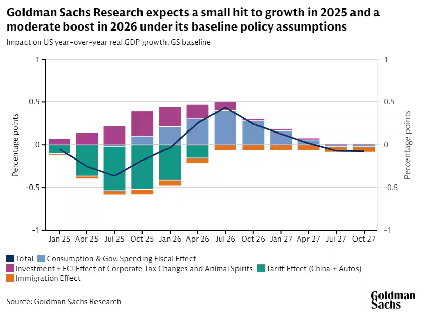Согласно базовому сценарию Goldman Sachs Research, торговая политика может оказать чистое влияние на ВВП США в 2025 году на уровне 0,2 процентных пункта. Если будут введены более высокие, чем ожидалось, тарифы по всем направлениям, это может привести к чистому снижению в среднем на 1 процентный пункт в 2026 году (хотя оно может быть и ниже, если доходы от тарифов будут полностью использованы для снижения налогов).