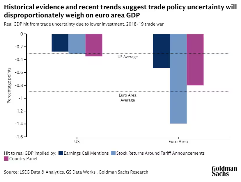 Экономисты GS снизили свой прогноз роста экономики еврозоны в 2025 году после результатов выборов в США на 0,5 процентных пункта (четвертый квартал по сравнению с четвертым кварталом прошлого года) и, вероятно, еще больше снизят его, если США введут всеобъемлющие тарифы.