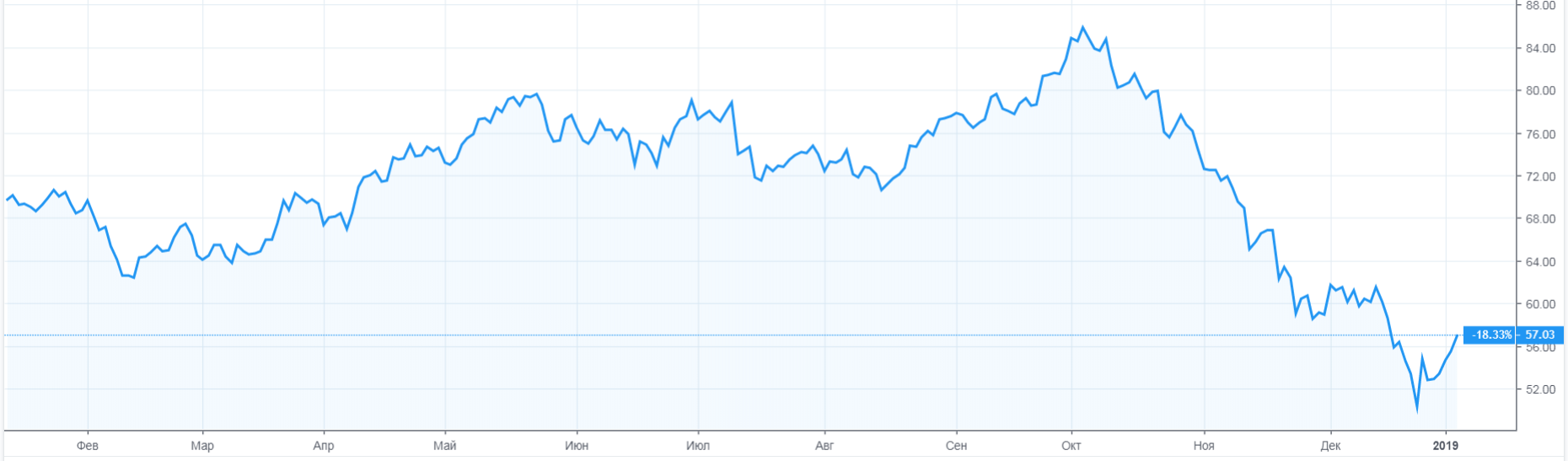Возможно, в 2019 году восстановиться ценам поможет соглашение ОПЕК+, которое было заключено для остановки «кровопролития» на рынке нефти. Brent в этом году в среднем будет оцениваться в $73, в 2020-м – $64, прогнозируют в JPMorgan. Респонденты Bloomberg ожидают котировки этой марки на уровне $70, тогда как в первые дни января 2019 года Brent торговалась по $54–57.