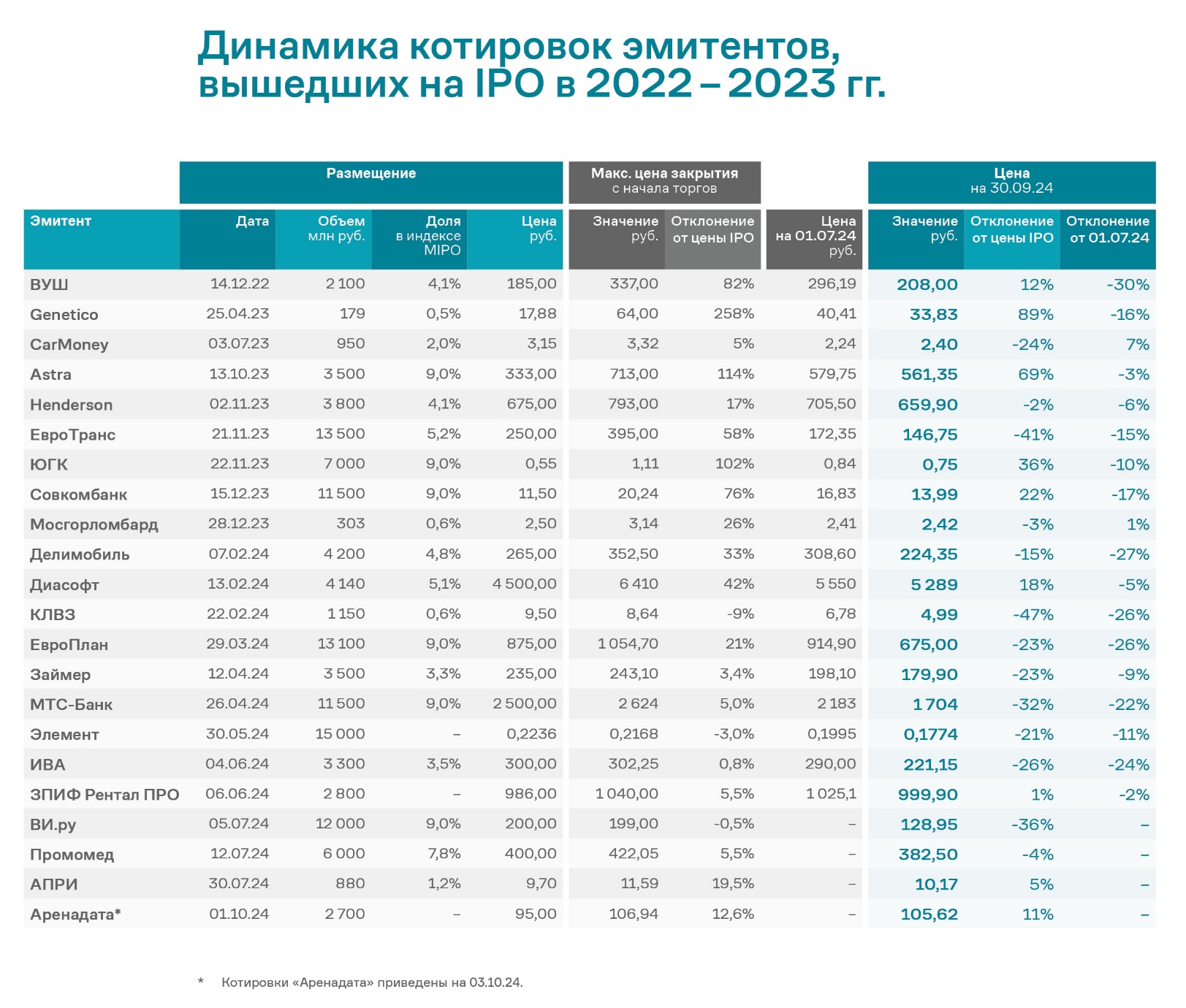Всего, включая размещение 1 октября, в 3-м квартале на биржу вышло 4 эмитента: онлайн-магазин «Все инструменты», биофармацевтическая группа компаний «Промомед», застройщик «АПРИ» и разработчик ПО для систем управления и хранения данных «Аренадата». И, несмотря на ухудшающуюся конъюнктуру рынка, размещения 3-го квартала пока что выглядят более удачными, чем IPO 2-го квартала: акции двух эмитентов – «АПРИ» и «Аренадата» – в первые дни торгов превысили цену размещения на 19,5% и 12,6% соответственно, в то время как бумаги дебютантов 2-го квартала смогли увеличиться в цене максимум на 5,5%, а в настоящее время только паи ЗПИФ «Рентал ПРО» торгуются на уровне цены размещения, а остальные акции просели от цены размещения на 20-30%.