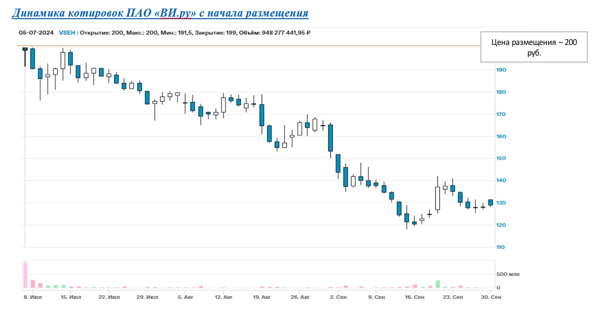 Раскрытая в конце августа отчетность по МСФО за 6 месяцев, в которой отражено сокращение темпов роста выручки до 35% к АППГ и падение чистой прибыли практически до нуля, привела к ослаблению котировок к середине сентября до 40% от цены размещения – до 120 рублей за акцию. Затем прошла небольшая корректировка, и в настоящее время бумаги торгуются в районе 130 рублей за штуку (-36% к цене размещения).