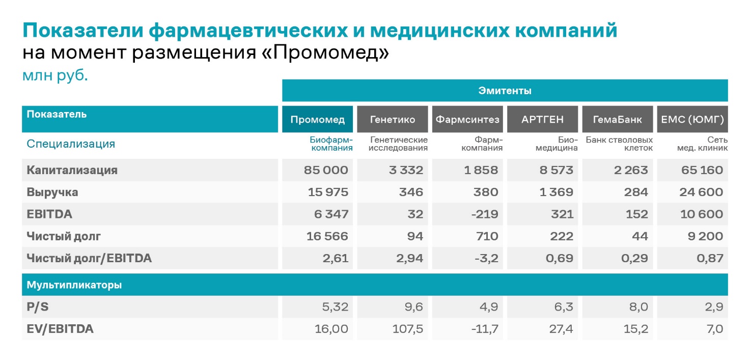 Группа компаний «Промомед» провела размещение в формате cash-in по верхней цене объявленного диапазона в 375-400 рублей за акцию, что соответствует оценке в 85 млрд руб. Объем размещения составил порядка 6 млрд рублей, free-float около 7%, акции компании попали во второй котировальный список ММВБ под тикером PRMD и были допущены к торгам с 12 июля.