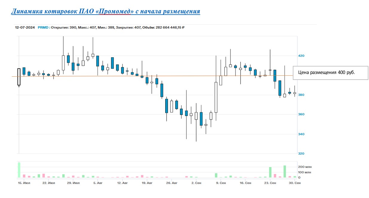 Позитивным толчком для роста цены акций компании стал прогноз экспертов «БКС мир инвестиций» и «Атона» по цене бумаг на уровне 700 руб. (+71% от цены на момент релиза) и 605 руб. (+48%) соответственно, «если компания будет следовать плану вывода новых лекарств». Однако пока что эта новость смогла только восстановить котировки до уровня цены размещения, и на конец сентября акции «Промомеда» торгуются на 4% ниже цены IPO.