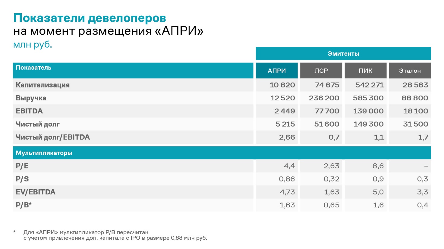 Сравнение мультипликаторов «АПРИ», рассчитанных по текущим показателям группы, с мультипликаторами аналогов показывает, что компания практически не предоставила инвесторам так называемый IPO-дисконт. Однако, учитывая озвученный эмитентом прогноз по вводу 604,2 тыс. кв.м. жилья в 2025 году против 280,1 тыс. кв.м. в 2024 году (рост более, чем в 2 раза), мультипликаторы уже не выглядят завышенными.