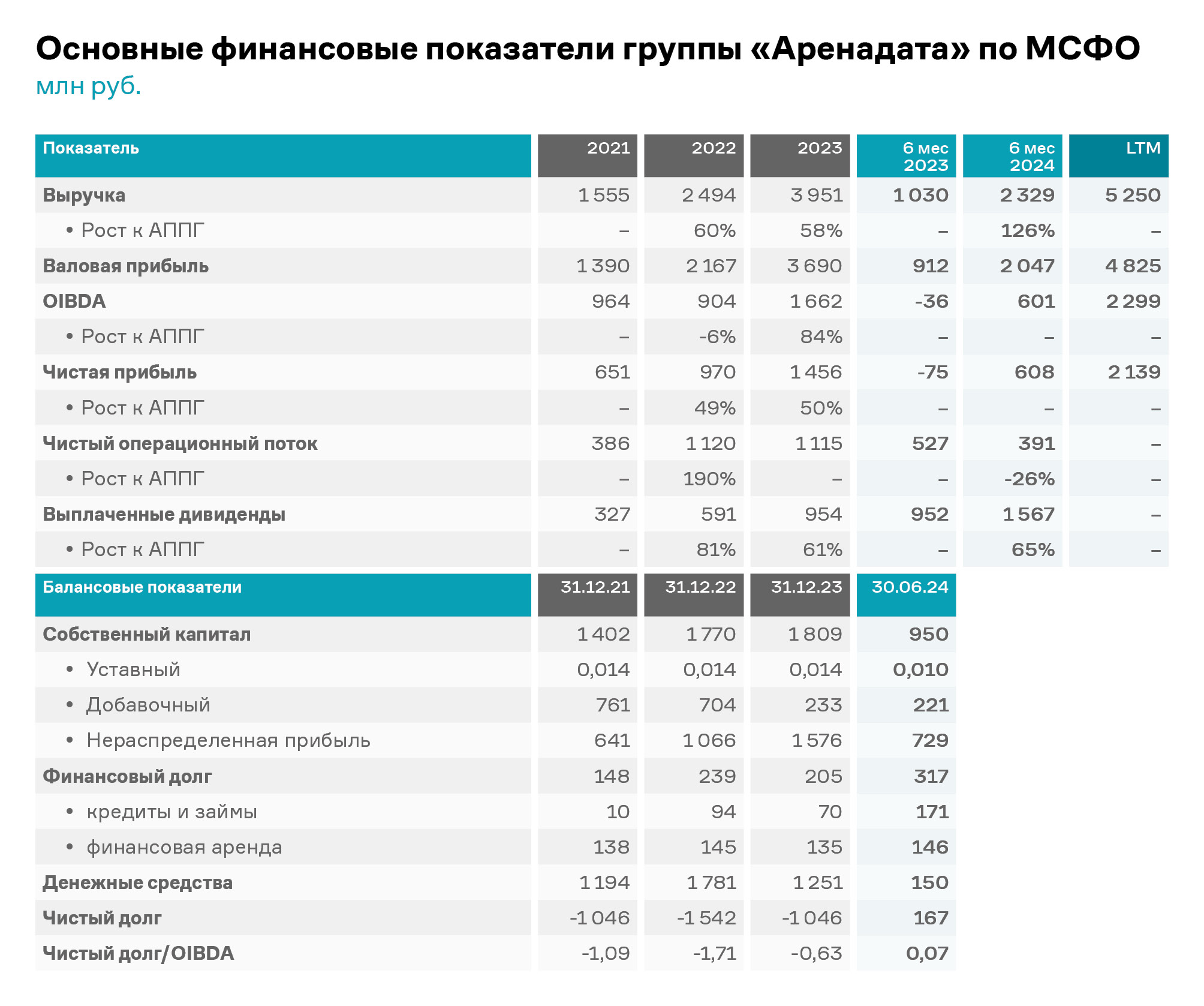 После ухода с российского рынка американских и европейских компаний финансовые показатели группы показали значительный рост: выручка и чистая прибыль увеличились к значениям 2021 года в 2,5 и 1,2 раза соответственно, показатель OIBDA – в 1,7 раз. Чистый денежный поток по операционной деятельности в 2022 и 2023 годах превышал 1 млрд руб., что свидетельствует о том, что отраженная в PL прибыль не является «бумажной», а осела на расчетных счетах компаний группы, в результате чего группа направляла на дивиденды значительные суммы, которые увеличивались с каждым годом: с 327 млн руб. в 2021 году до 1,57 млрд руб. в 1-м полугодии 2024 года. Чистый финансовый долг при этом находился в отрицательных или околонулевых значениях.