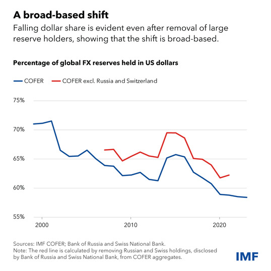 Последние данные МВФ о валютной структуре официальных валютных резервов (COFER) указывают на продолжающееся постепенное снижение доли доллара в распределенных валютных резервах центральных банков и правительств.