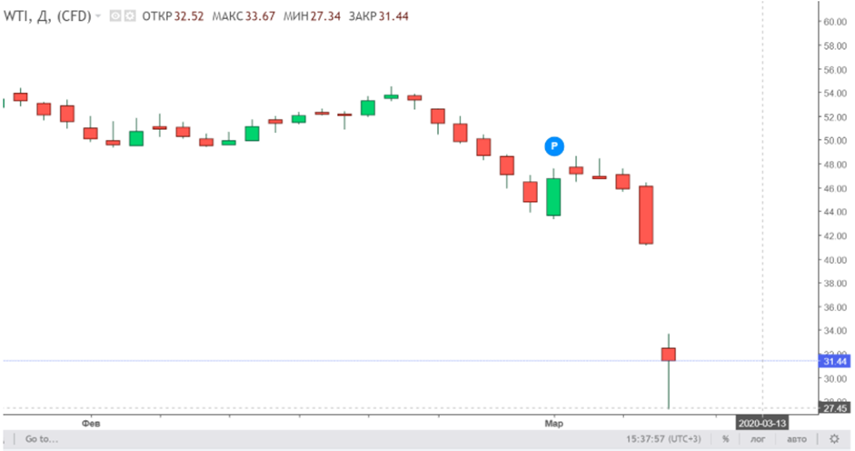 На графике заметно, что цена нефти WTI упала с 48 долларов за баррель до 27 долларов. Это самое быстрое падение за последние 6 лет. И у него есть свои причины.