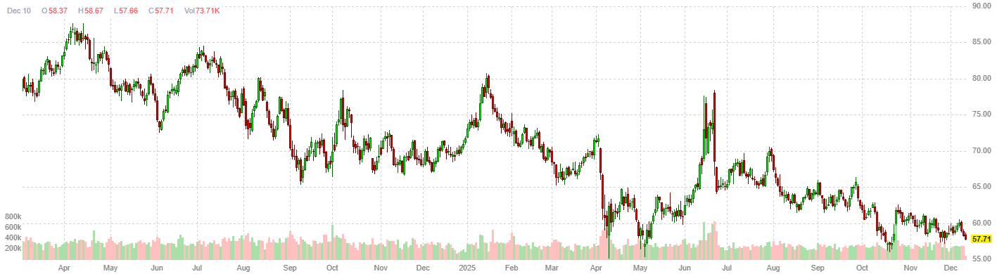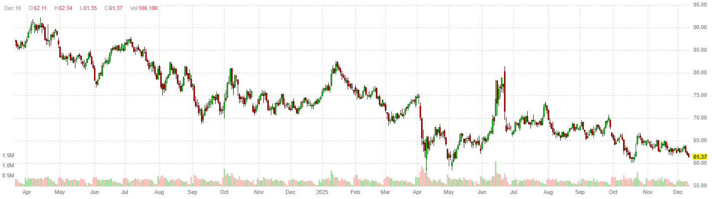 С начала ноября нефть торгуется в узком коридоре: разница между минимумом и максимумом цен составляет около $4 за баррель. Такой диапазон отражает противостояние опасений переизбытка предложения и геополитических рисков, связанных с поставками российских санкционных объёмов.