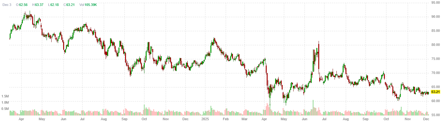 На момент подготовки материала нефть марки Brent прибавила 1,22% — до $63,21, оставаясь в узком диапазоне последних сессий.