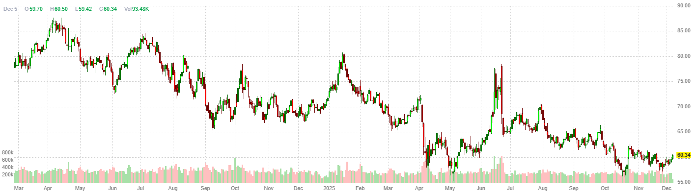 Рынок также оценивает возможное снижение ставок Федеральной резервной системы США и напряжённость вокруг Венесуэлы — оба фактора способны поддержать цены на нефть.