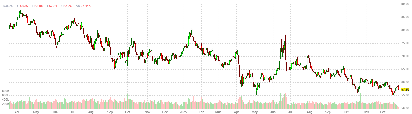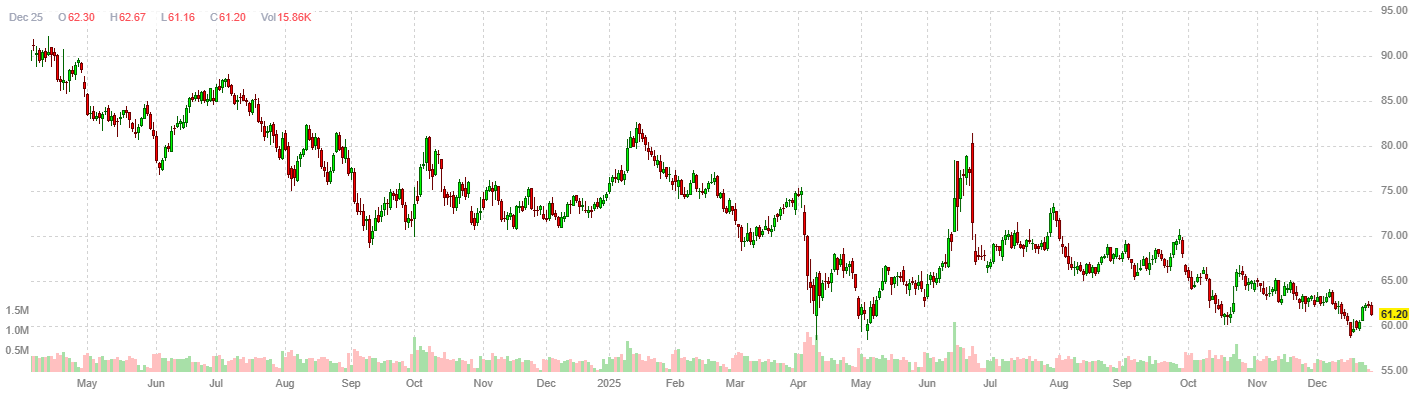 Несмотря на геополитические риски, поддерживающие цены, WTI остаётся на пути к крупнейшему годовому падению с 2020 года — около 18%. Давление на рынок усиливают ожидания профицита: крупнейшие мировые трейдеры прогнозируют глобальный избыток нефти в следующем году после роста поставок как внутри ОПЕК+, так и за её пределами.