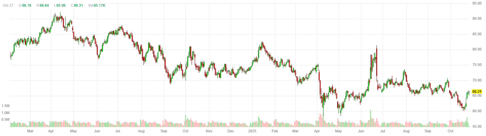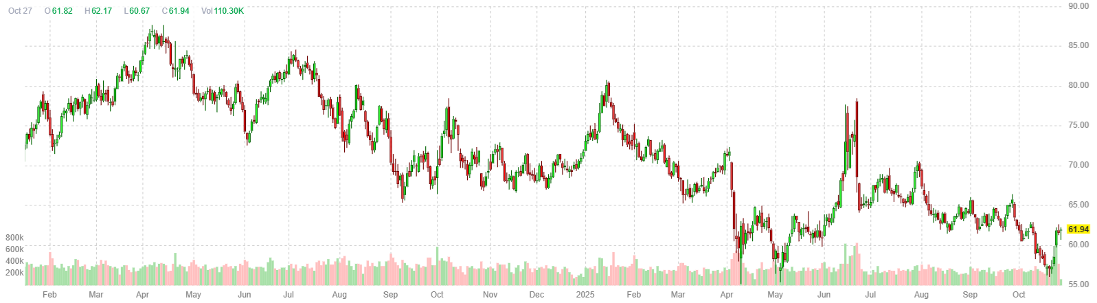 Слабая динамика потребления продолжает сдерживать рост котировок: ранее в октябре Brent опускалась до минимальных значений с мая. Однако новые санкции США и ЕС против России, а также более сильные, чем ожидалось, данные по спросу в США помогли стабилизировать рынок. При этом аналитики отмечают, что дальнейшая динамика будет зависеть от устойчивости внутреннего потребления в США — в противном случае давление на котировки может усилиться.