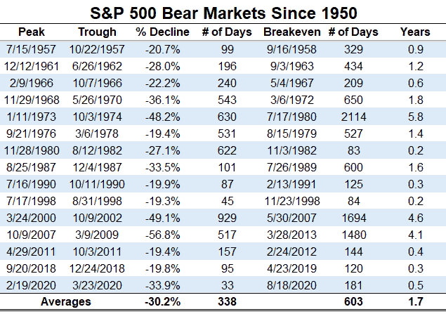 Исторические сравнения не могут дать представление о текущей ситуации, но они могут помочь взглянуть на вещи в перспективе с точки зрения продолжительности прошлых медвежьих рынков.