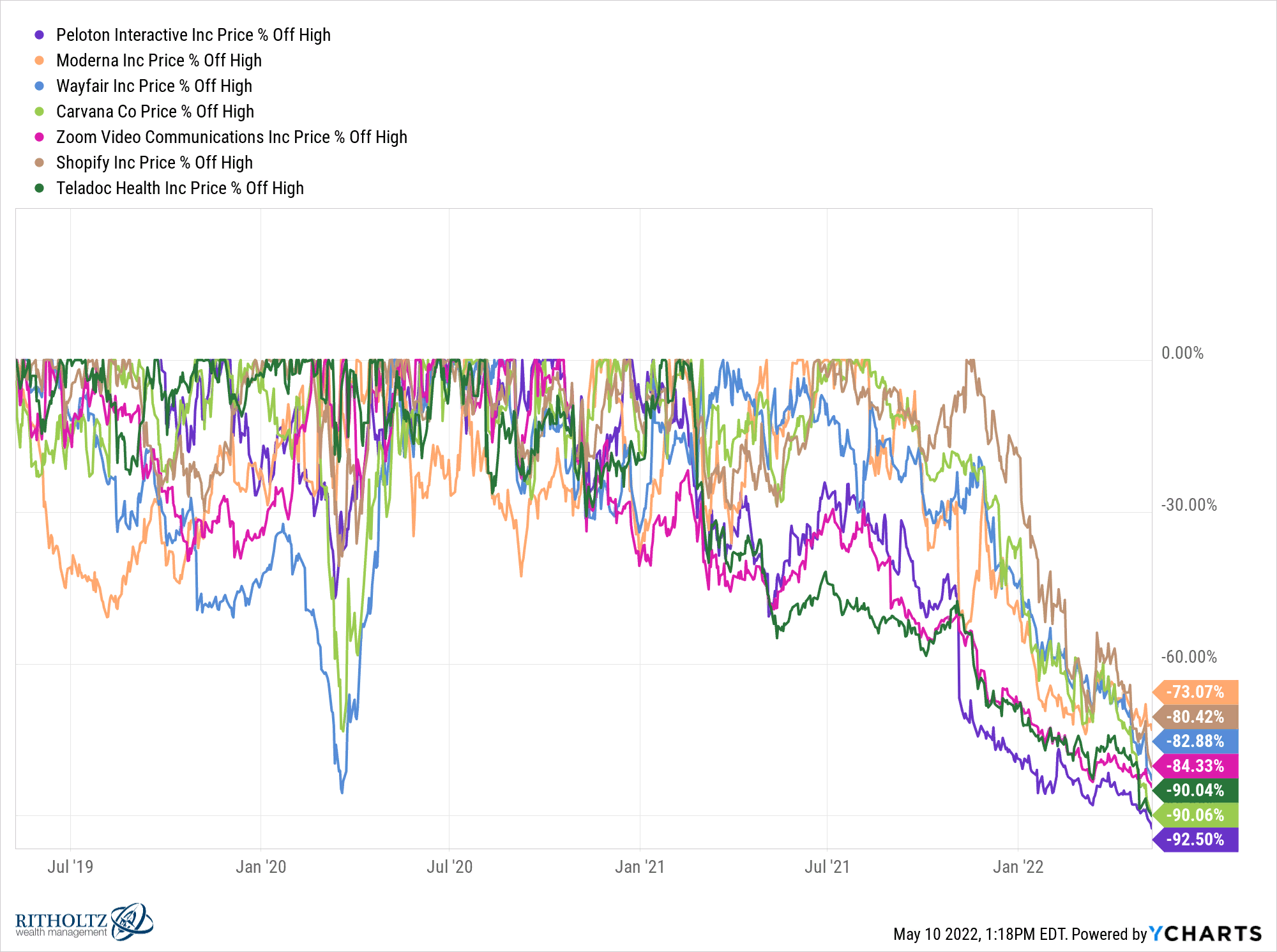 А потом? Потом они же рухнули – на 80-90%. Среди них: Peloton, Carvana, Moderna, Zoom и другие: