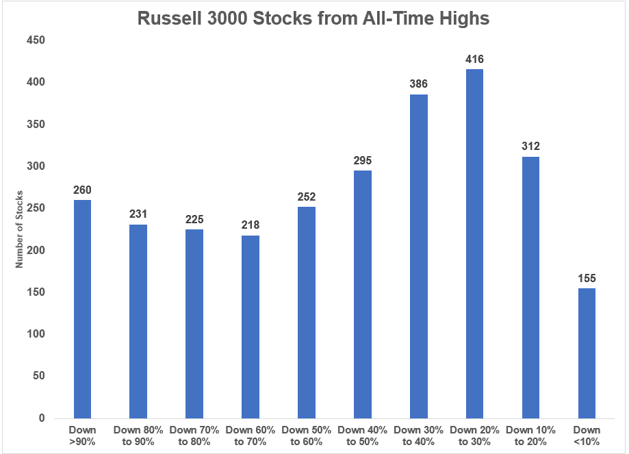 Индекс широкого рынка Russell 3000 состоит из более чем 2700 акций. В настоящее время индекс ниже на 18% от своих максимумов. Но интересно другое.