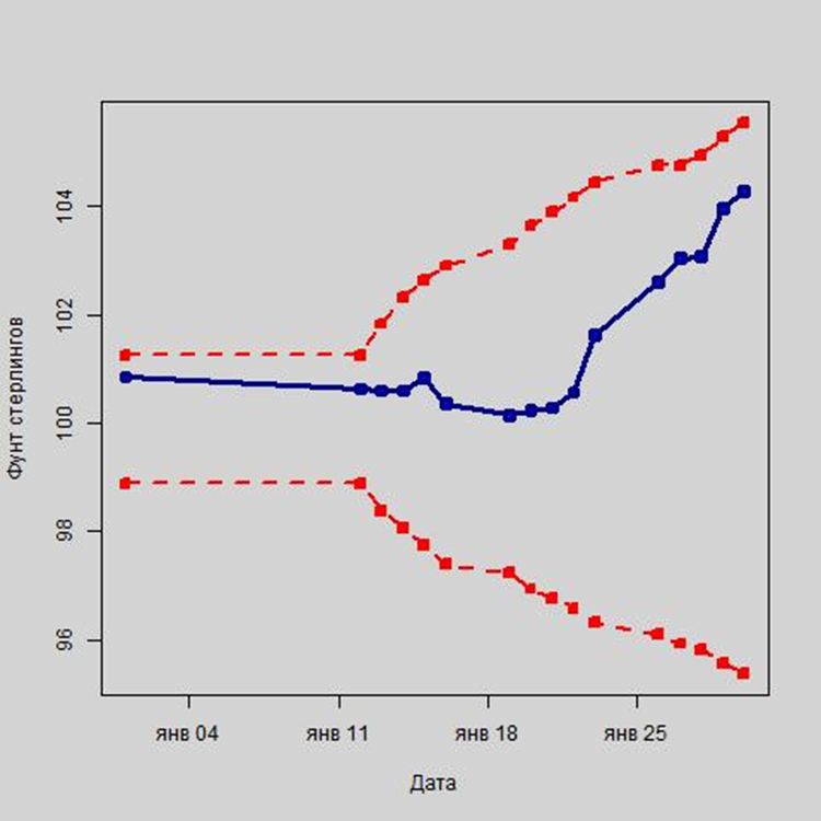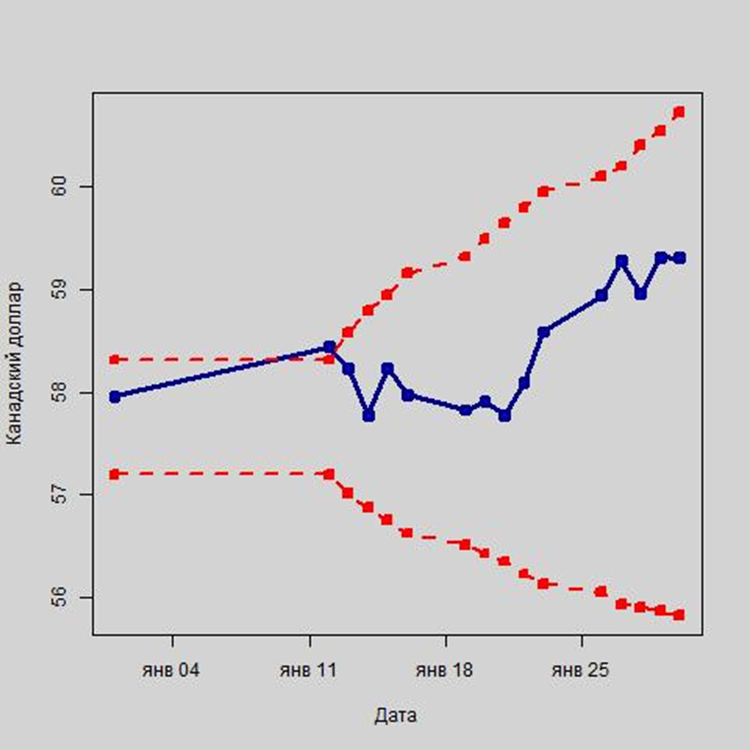 Теперь давайте посмотрим, каким будет курс австралийского доллара 27 февраля 2021 г. Согласно точечному прогнозу, курс австралийского доллара будет равен 58,7716 руб., в соответствии с интервальным прогнозом его нижняя граница составит 56,0601 руб., а верхняя – 61,4830 руб. При этом по мере роста прогнозируемого периода в связи с ростом неопределенности, а, следовательно, и повышением риска, существенно расширяется интервал прогноза. Так, диапазон интервального прогноза для 2 февраля 2021 г. составит 1,0819 руб., а для 27 февраля 2021 г. – 5,4229 руб.