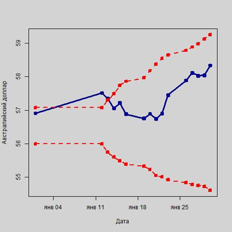 Рис. 9. Колебания курса австралийского доллара в рамках интервального прогноза, в руб.