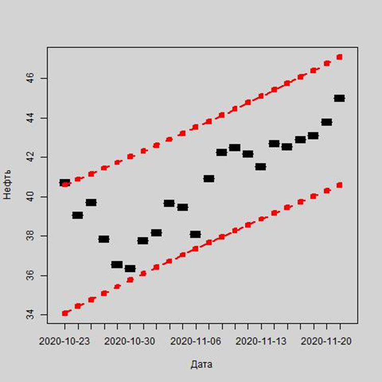 Судя по графику на рис. 1, ожидаемое колебание цен на нефть марки Brent на 23.10.2020 г. прогнозировалось в пределах от 34,07 долл. и до 40,60 долл. за баррель, а по данным на 23.11.2020 г. они уже прогнозировались в диапазоне от 40,57 долл. до 47,09 долл. за баррель. Заметим, что эти краткосрочные прогнозы по ценам на нефть построены с упреждением в один торговый день. На рис. 1 нижняя и верхняя границы интервального прогноза обозначены красным цветом.