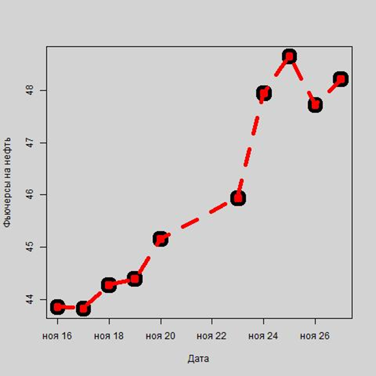 При этом регрессионный анализ ежедневной динамики курса нефти показывает, что ее ноябрьский тренд может быть описан следующей формулой: