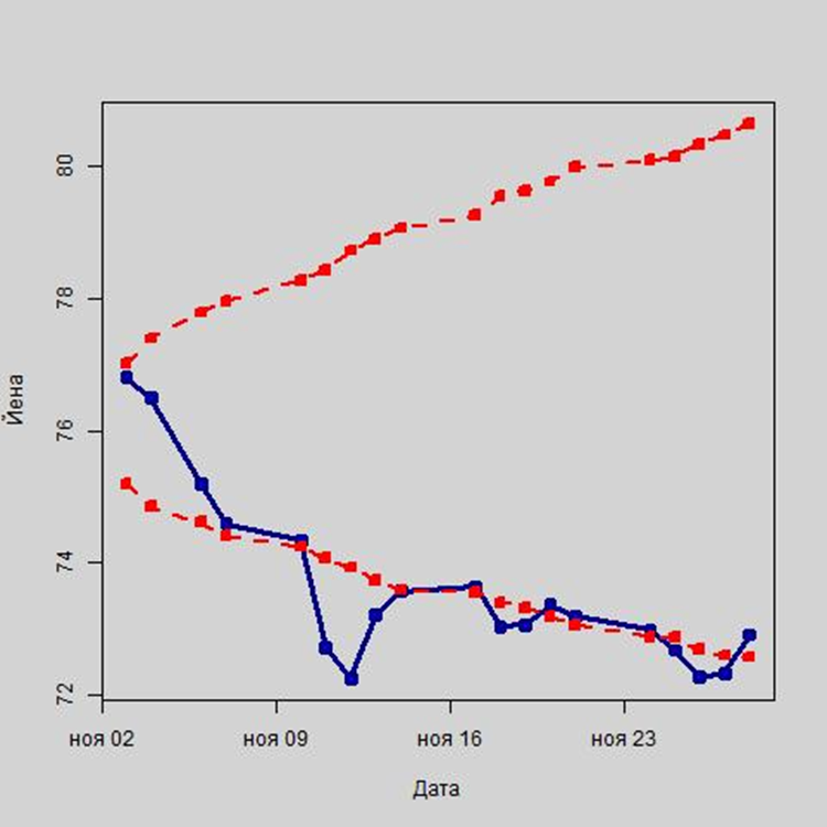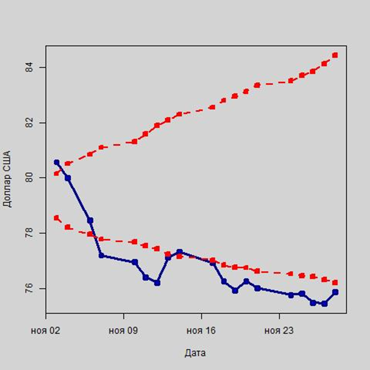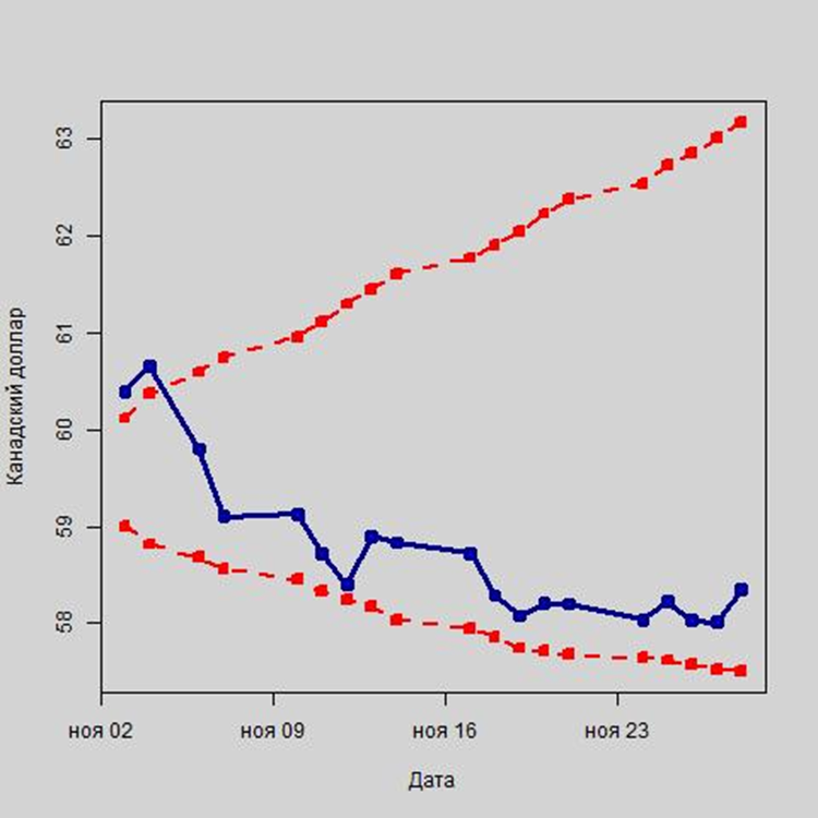 Судя по графику на рис. 9, курс австралийского доллара в конце ноября т. г. должен был быть не ниже 53,4854 руб. и не выше 58,9228 руб., ну а фактический официальный курс этой валюты оказался равен 55,9618 руб., то есть в рамках прогноза. При этом в ходе последнего месяца курс австралийского доллара достиг своего локального максимума 04.11.2020 г., когда он равнялся 56,7684 руб., а до своего локального минимума валюта упала 21.11.2020 г., когда ее курс равнялся 55,4127 руб. На графике нижняя и верхняя границы интервального прогноза обозначены красным цветом.