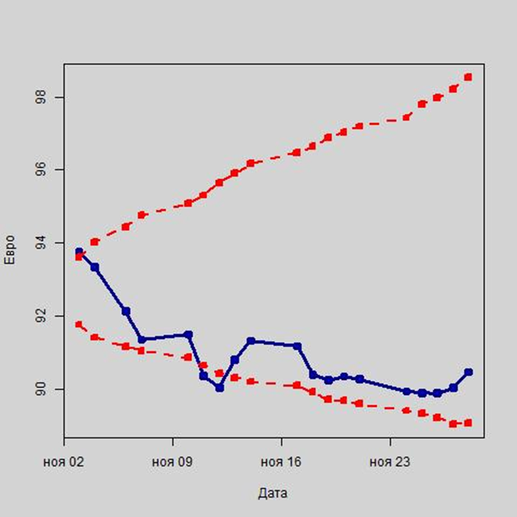 Рис. 9. Колебания курса австралийского доллара в рамках интервального прогноза, в руб.