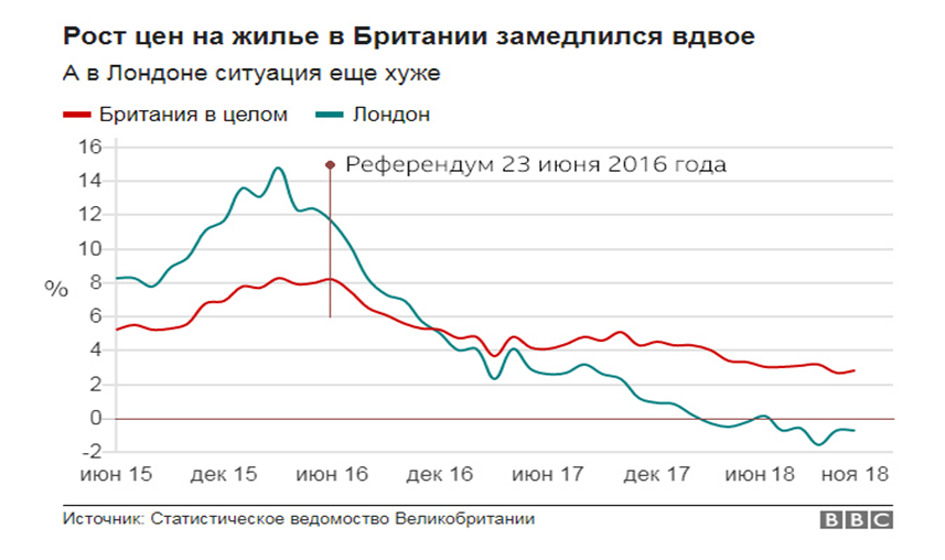 Как видно из графика продажи падают и будут падать в дальнейшем. Однако Брексит негативно сказывается не только на розничных продажах, но и на угасании роста цен на недвижимость в целом: