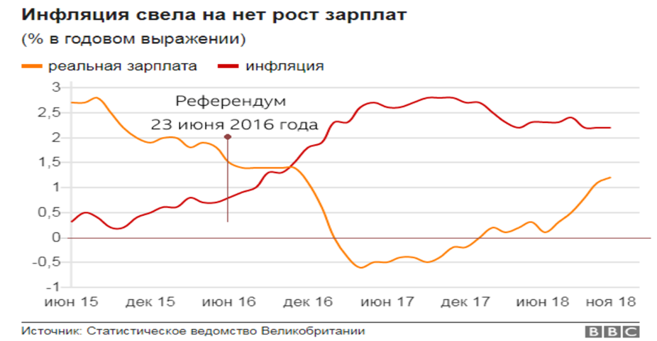 Параллельно обостряются политические проблемы с Северной Ирландией, которая не настроена выходить из еврозоны. Далее уже намечается конфликт интересов США и ЕС, которым интересен рынок Великобритании. После выхода Великобритания из ЕС, стране придётся заново налаживать как старые, так и новые экономические взаимоотношения со странами-поставщиками продовольствия, топлива, медикаментов. Эта страна всегда стояла особняком, пытаясь быть экономически и политически независимым государством, что ей удавалось благодаря своей мощи. Однако, проголосовав за выход из ЕС, сменив при этом несколько правительств, Британия наглядно показала потерю былой силы, раздробленность и свою политическую недальновидность. Последствия таких смелых политических решений дают о себе знать уже сейчас. В стране падает покупательская способность. Это можно наблюдать, проанализировав следующие графики.