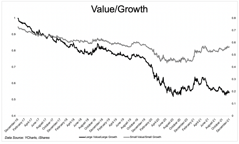 Как отмечает биржевик, в 2021 году, акции роста малой капитализации показали доходность в 2,5% в то время, как акции стоимости малой капитализации – в 28%.
