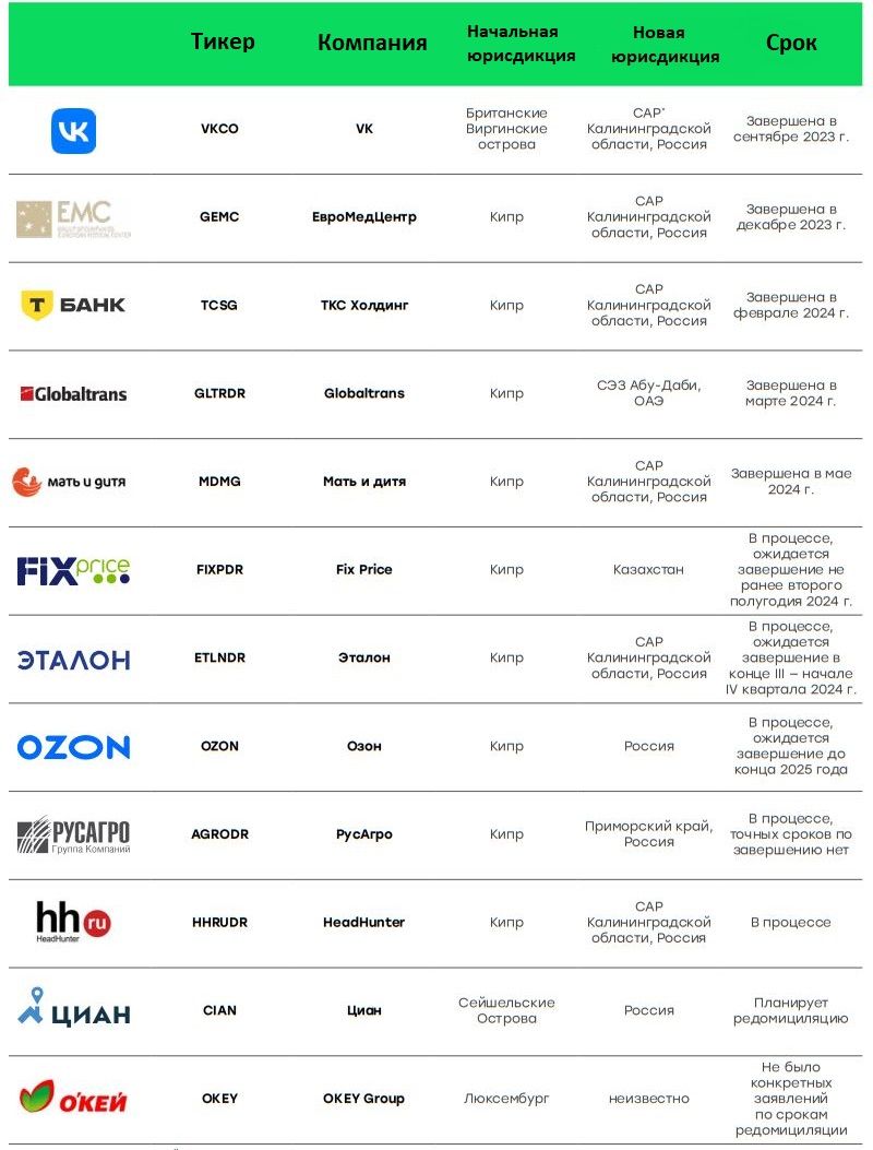 Большинство компаний переезжают в Россию, хотя встречаются и исключения в виде Globaltrans и Fix Price, которые выбрали для переезда юрисдикции ОАЭ и Казахстана соответственно. В свою очередь, РусАгро, Циан, Эталон, Fix Price, HeadHunter, Ozon и OKEY Group находятся в процессе смены юрисдикции.