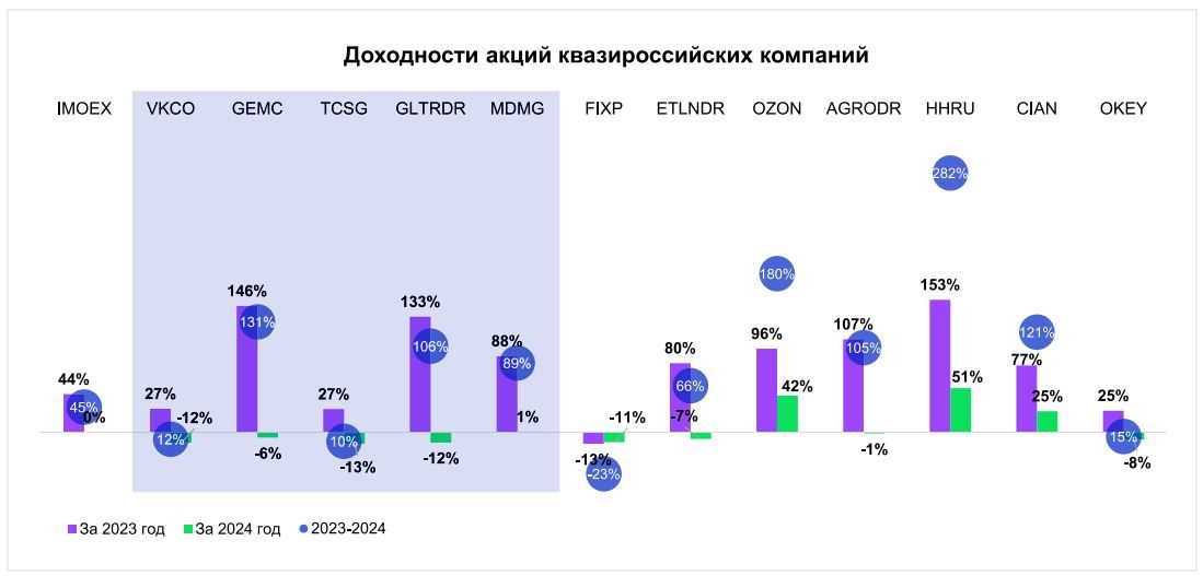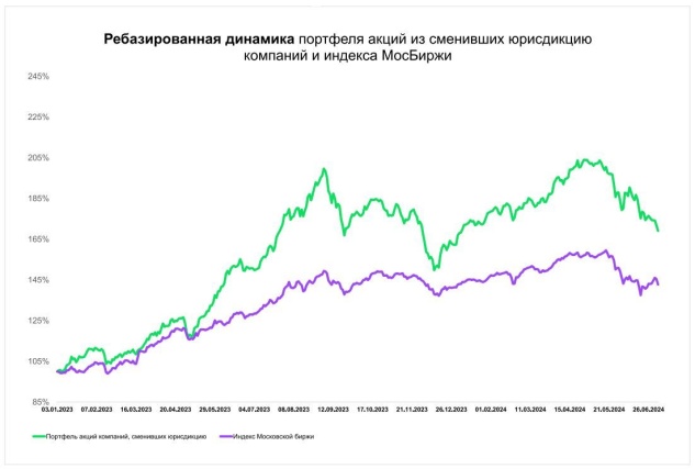 В период с начала 2023 года по начало июля 2024 года равновесный портфель акций сменивших юрисдикцию компаний показал рост на 69%. По итогам 2023 года портфель подорожал на 62% (по сравнению с ростом индекса МосБиржи на 43%), а самый сильный рост показали акции Globaltrans (+133,3%), РусАгро (+107,5%), «ЕвроМедЦентр» (+145,7%), «Мать и дитя» (+88%).