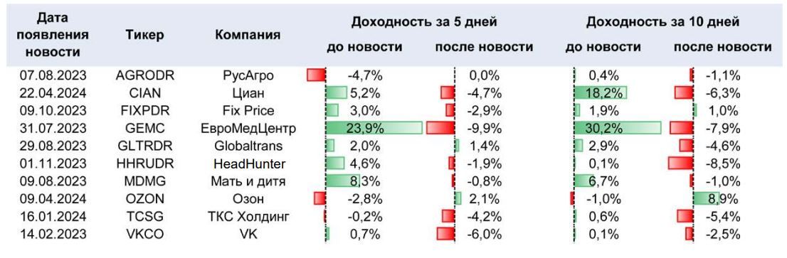 Мы рассмотрели динамику котировок акций компаний, сообщавших о редомициляции, на горизонте от пяти и до десяти дней до и после появления новостей о планируемом переезде. Акции в большинстве случаев показывают рост еще до появления новости. Исключением выступают акции Озона, которые подорожали на 8,9% за десять дней после появления новости. В восьми случаях из десяти котировки акций показали снижение через пять-десять дней после появления новости. Возможно, рынок предвидит редомициляцию и начинает расти еще до официального объявления новости.