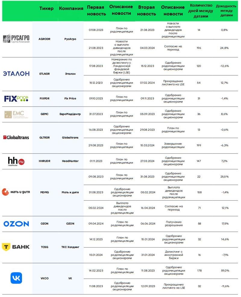 К этому событию относятся заявления компании заявляет о намерении и сроках проведения редомициляции. Примерами таких новостей могут являться сообщения эмитентов: