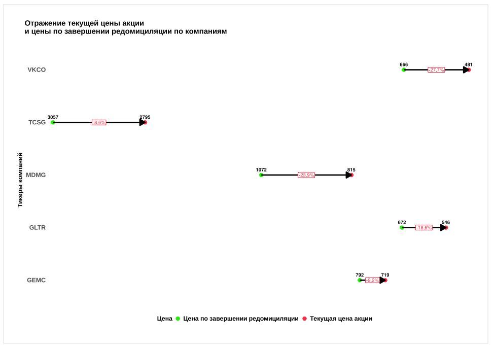 Котировки акций всех компаний, изменивших свою юрисдикцию, снизились по завершении процесса редомициляции. Акции компании «Мать и дитя», которая переехала в мае 2024 года, показали самое сильное снижение. За 41 день они потеряли 23,9%, что соответствует 213% в годовом выражении. Акции Globaltrans за 115 дней потеряли 18,6% стоимости, что в годовом исчислении эквивалентно падению на 59%. Открытие длинных позиций по акциям после завершения процесса перерегистрации не является оптимальным решением. Инвесторам может быть не очевидна стратегия и перспективы компании после переезда, в том числе изменение корпоративного управления и дивидендной политики, что приводит к навесу продавцов в биржевом стакане.