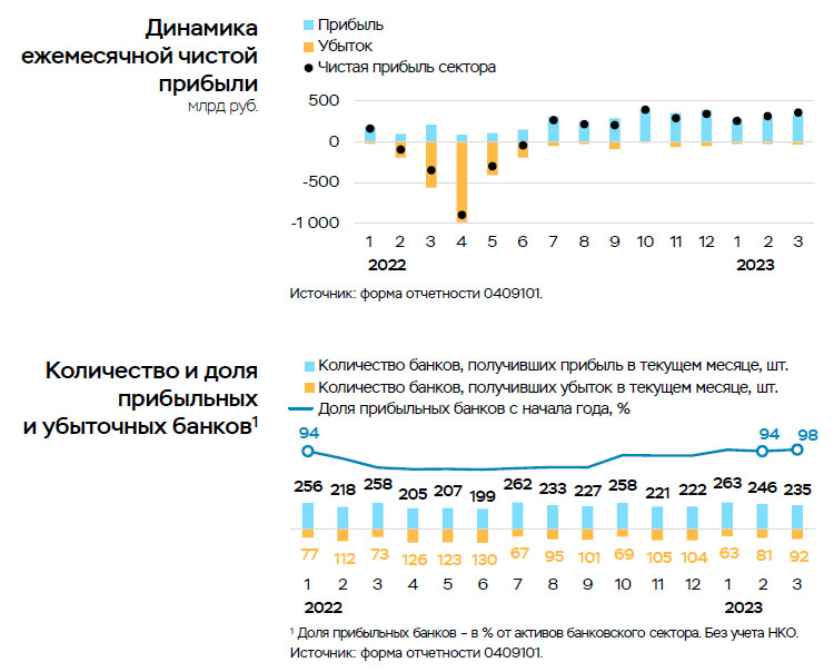 По итогам 1 квартала 2023 года банковскому сектору в целом удалось выйти на прибыльную работу. Прибыль сектора в целом составила 881 млрд. рублей. По данным Центробанка, без учета валютной переоценки на фоне ослабления рубля и корректировок прибыли прошлых лет результат был бы ниже, около 500 млрд. рублей. Количество прибыльных банков по итогам 1 квартала 2023 года составило 270 или 83% от общего числа, на их долю приходилось 98% активов банковской системы страны. Впрочем, при возможности банков использовать регуляторные послабления Центробанка прибыль в финансовой отчетности некоторых банков может иметь весьма отдаленное отношение к реальности.