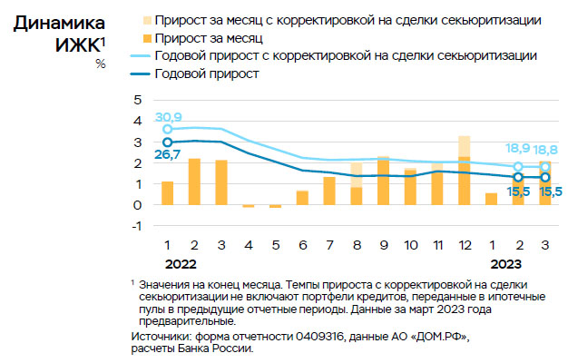 В значительной мере росту объема ипотеки способствовали льготные госпрограммы. Выдачи по госпрограмме «семейная ипотека» составляют около 50% от выдач по госпрограммам. По-прежнему популярна госпрограмма «льготной ипотеки», поддержанная комбинированными программами «льготной ипотеки от застройщика». Однако регуляторные меры Центробанка с 30 мая 2023 года сделают программы ипотеки от застройщиков по экстремально низким ставкам невыгодными для банков. Центробанк уверен, что нерыночные ставки по такой ипотеке достигаются за счет завышения стоимости жилья.