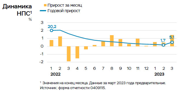 Портфель потребкредитов за 1 квартал 2023 года вырос на 2,5% и составил 12,3 трлн. рублей. После умеренных темпов роста в январе-феврале в марте месяце потребкредитование оживилось и вышло на темпы роста докризисного 2021 года. Рост потребкредитования может быть связан как с возросшей потребительской активностью, так и со смягчением требований банков к качеству заемщиков.