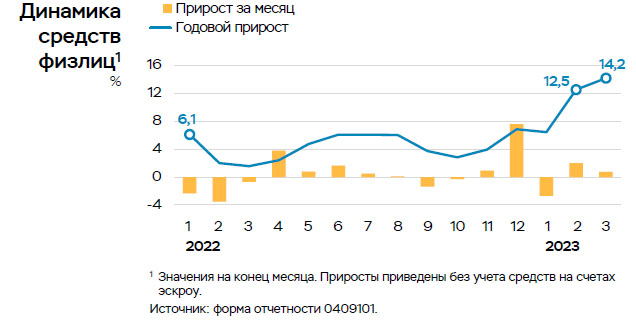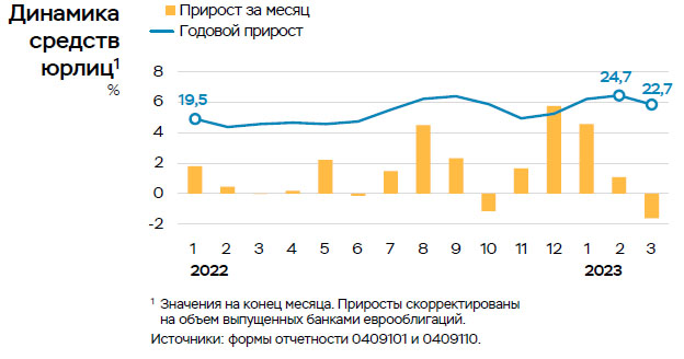 Объем средств юрлиц в банках на конец 1 квартала 2023 года составил 46,1 трлн. рублей. Прирост средств юрлиц на счетах в банках за 1 квартал 2023 года составил 4%. На графике ниже хорошо заметно, что бОльшая часть прироста произошла в январе. В марте произошел отток средств со счетов компаний, что обусловлено перечислением налогов в бюджет, в том числе – уплатой нефтегазовыми компаниями налога на дополнительный доход за 2022 год.