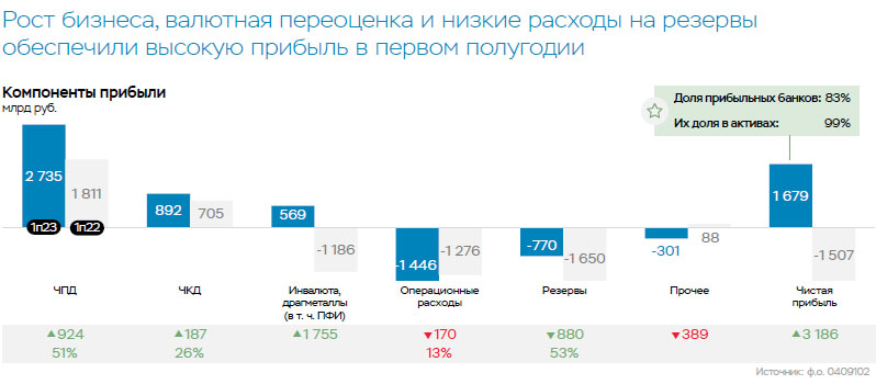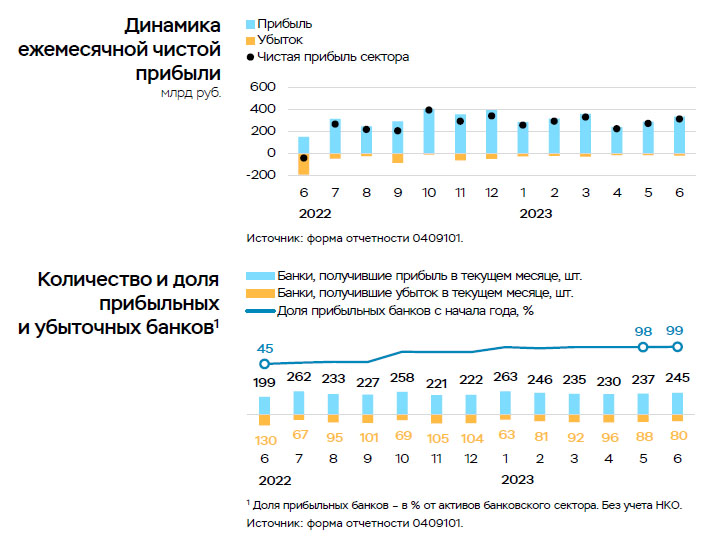 По итогам 1-го полугодия 2023 года банковскому сектору в целом удалось выйти на прибыльную работу. Прибыль сектора в целом составила 1,7 трлн. рублей. Такой выдающийся результат объясняется ростом объемов банковского бизнеса, ростом комиссионных доходов, валютной переоценкой и низкими расходами на создание резервов по ссудам. Банковская маржа остается на стабильно высоком уровне. Количество прибыльных банков по итогам 1-го полугодия 2023 года составило 271 или 83% от общего числа банков, на их долю приходилось 99% активов банковской системы страны.