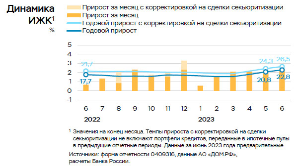 В значительной мере росту объема ипотеки способствовали льготные госпрограммы – «семейная ипотека» и «льготная ипотека», поддержанная комбинированными программами «льготной ипотеки от застройщика». Однако регуляторные меры Центробанка с июня 2023 года сделали программы ипотеки от застройщиков по экстремально низким ставкам невыгодными для банков. Центробанк уверен, что нерыночные ставки по такой ипотеке достигаются за счет завышения стоимости жилья. Частично рекордный объем выдач ипотеки может объясняться желанием получить кредит до вступления в силу этих ограничений.