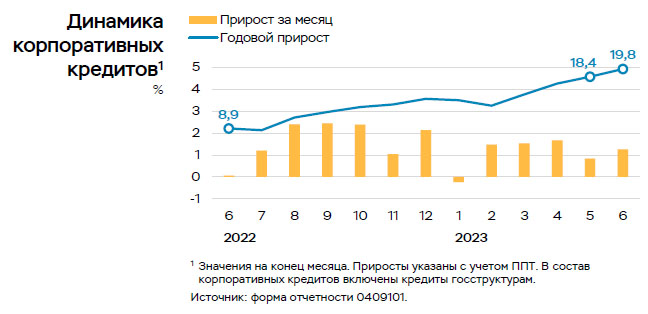 За период с февраля 2022 года по июнь 2023 года банки реструктурировали кредиты предприятиям на общую сумму в 11 трлн. рублей или 21% от совокупного кредитного портфеля. По ссудам компаниям малого и среднего бизнеса было реструктурировано 89 тыс. кредитных договоров на общую сумму 1,4 трлн. рублей. По мнению Банка России, риски по реструктурированным кредитам крупным компаниям умеренные, т.к. около половины реструктуризаций пришлось на крупных застройщиков жилья, на нефтегазовые и топливо-энергетические компании.