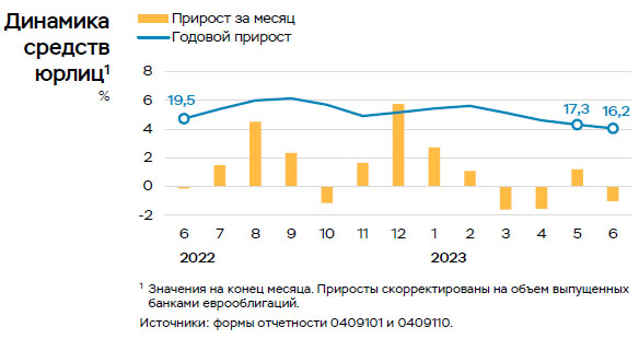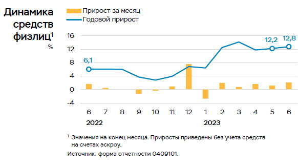 Остаток средств физлиц в банках за 1-е полугодие 2023 года возрос на 5% и составил 39,3 трлн. рублей. Основной прирост пришелся на 2-й квартал. По данным Банка России, средства населения в банках растут в основном за счет социальных и бюджетных выплат. Продолжается снижение доли валютных остатков физлиц в банках из-за конвертации валюты в рубли, переводов валюты на счета в зарубежных банках и снятия наличной валюты в период отпусков. Доля валютных средств физлиц в банках снизилась с января 2022 года по июнь 2023 года с 20% до 9%.