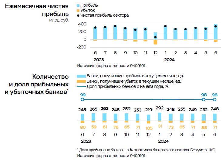 Количество прибыльных банков по итогам 1-го полугодия 2024 года составило 248 или 78% от общего числа. Общая доля прибыльных банков в активах банковского сектора составила 98%, т.е. убытки получили в основном малые банки. Хотя начало года традиционно не считается показательным, и затем доходность банковского бизнеса может измениться, результаты работы банков все равно впечатляют.