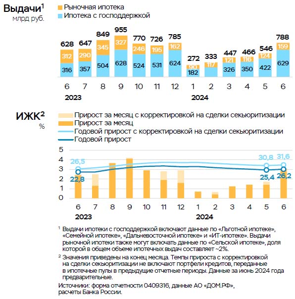 При этом объем портфеля ипотечных кредитов физлицам вырос на 9,1% и составил 19,8 трлн. рублей. В начале года темпы выдач ипотечных кредитов были ниже обычного, что объясняется высокими показателями декабря 2023 года. Однако в мае и июне прирост выдач ипотечных кредитов значительно ускорился в ожидании банками и их клиентами ужесточения условий льготных госпрограмм. В значительной мере росту объема ипотеки способствовали именно льготные госпрограммы – «семейная ипотека» и «льготная ипотека», поддержанная комбинированными программами «льготной ипотеки от застройщика». На льготные госпрограммы ипотеки в конце полугодия по данным Банка России приходилось 80% от всех выдач. После ужесточения условий массовой программы «льготная ипотека» самой популярной остается программа «семейная ипотека». Активно растут выдачи и по программе «IT-ипотека». Средний размер ипотечного кредита в мае 2024 года составил 3,7 млн. рублей. В топ-3 регионов на рынке ипотечного кредитования традиционно входят Москва, Московская область и Петербург – как по объему выдач, так и по задолженности. Доля проблемных ипотечных кредитов пока остается на рекордно низком уровне – 0,6%.