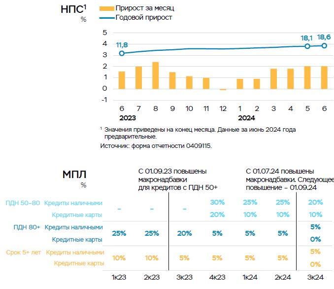 Портфель необеспеченных потребкредитов за 1-е полугодие 2024 года вырос на 9,8% и составил 14,9 трлн. рублей. Замедлению роста потребкредитования способствовали введение ограничений Банка России в части выдачи ссуд заемщикам с высокой долговой нагрузкой и рост процентных ставок по кредитам. Банки стали жестче относиться к анализу финансового положения потенциальных заемщиков. Однако пока сокращение объема выдач несколько меньше, чем планировал регулятор, вопреки всем введенным им ограничениям и росту процентных ставок. Часть роста выдач пришлась на портфель кредитных карт, ставки по которым всегда были высоки.