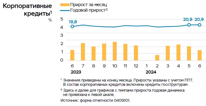 Объем кредитов юрлицам за 1-е полугодие 2024 года вырос на 7,5% и составил 78,8 трлн. рублей. После паузы в январе месяце рост выдач идет довольно активно, что обусловлено финансированием предприятиями текущей деятельности и реализацией новых проектов в рамках процесса трансформации экономики, финансированием банками сделок по выходу нерезидентов из российских активов, замещением внешнего долга компаний, проектным финансированием строительства жилья, а также необходимостью уплаты налогов предприятиями. Спрос на кредиты поддерживается высокими финансовыми результатами компаний, а также ожиданиями заемщиков в отношении дальнейшего роста ставок. В некоторых отраслях высокая прибыль позволяет компаниям без проблем обслуживать кредиты даже по текущим, относительно высоким, ставкам. Наиболее высокий рост рублевого корпоративного портфеля наблюдается в промышленных центрах и регионах с наибольшей инвестиционной привлекательностью. При этом идет девалютизация корпоративного кредитного портфеля за счет замещения валютных кредитов рублевыми.