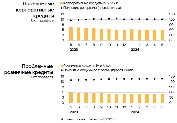 По мнению Банка России, качество розничного и корпоративного кредитных портфелей банков пока не указывает на значительное ухудшение платежной дисциплины со стороны заемщиков. Доля проблемных кредитов в корпоративном кредитовании составляла 5% от объема сводного кредитного портфеля, или 3,7 трлн. рублей. В розничном кредитовании доля проблемных кредитов составляла 4,2% или 1,5 трлн. рублей, в том числе доля проблемных необеспеченных потребкредитов 7,7%, ипотеки – 0,6%. Доля проблемных кредитов в портфелях в 2024 году даже немного снизилась, что вызвано не только ростом объемов кредитных портфелей, но и ужесточением отбора банками розничных заемщиков и урегулированием крупной проблемной корпоративной кредитной задолженности.